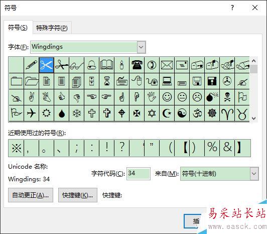 回到編輯頁面,按一下Tab鍵就可以畫出一條虛線。此時切換到“插入”選項卡,點擊工具欄右側“符號”按鈕,選擇“其他符號”,在打開的符號窗口中,“字體”選擇“Wingdings”,即可找到一把剪刀的圖標了,雙擊添加到文檔中。