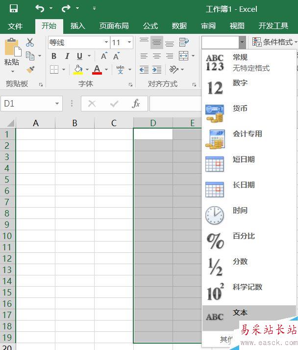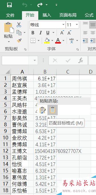 接下來新建一個Excel表格,選中任意兩列并在開始選項(xiàng)卡內(nèi)點(diǎn)擊下圖的下拉菜單(默認(rèn)為常規(guī),很容易找到),選擇“文本”。然后回到Word并按下Ctrl+A全選內(nèi)容并按下Ctrl+C復(fù)制,回到Excel表格,在圈選的兩列下點(diǎn)擊右鍵粘貼,選擇“匹配目標(biāo)格式”即可。注意,如果沒有先在Excel里選中默認(rèn)格式為“文本”,就會出現(xiàn)下圖中“6.1E+17”這樣的數(shù)學(xué)格式。