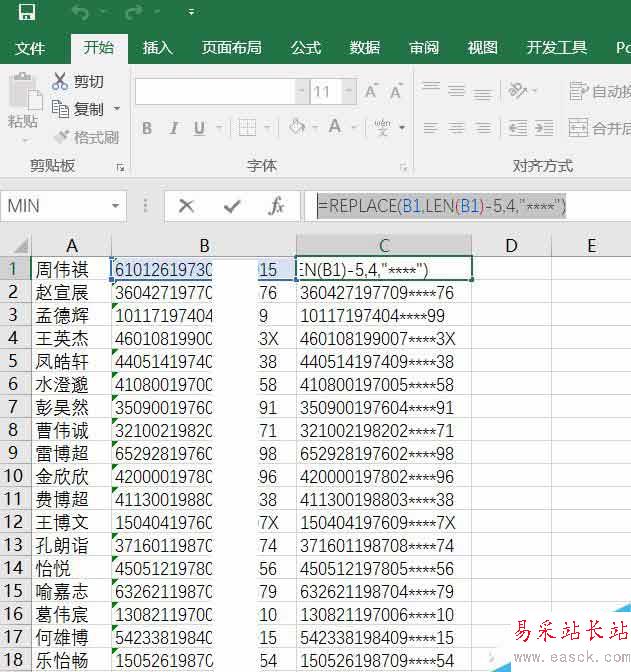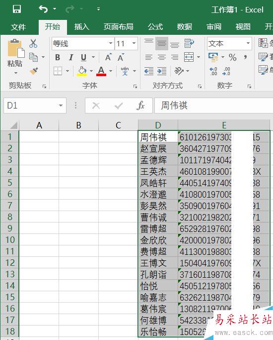 好了,身份證號也有規(guī)則的與名字對應(yīng)復(fù)制到表格內(nèi)了,但是身份證號明晃晃的就展示在屏幕上,對個人信息安全的保護(hù)并不到位,我們能不能隱藏其中幾位呢?