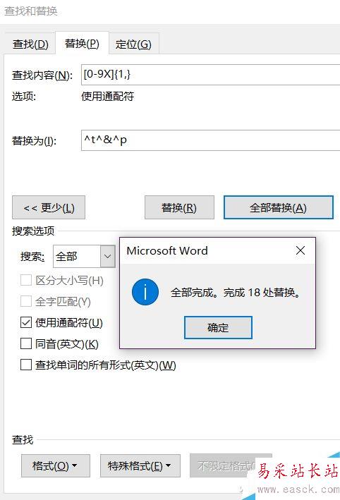 首先打開一個Word,將姓名身份證信息復(fù)制到其中(上圖為了保護(hù)隱私,涂抹了部分身份證號碼),然后按下Ctrl+H彈出“查找和替換”對話框,“查找內(nèi)容”處輸入[0-9X]{1,},“替換為”處輸入^t^&^p,點(diǎn)擊“更多”并勾選“使用通配符”,最后點(diǎn)擊“全部替換”。這時,所有數(shù)據(jù)都以Tab進(jìn)行區(qū)隔,并實(shí)現(xiàn)了名字對應(yīng)身份證號的格式。
