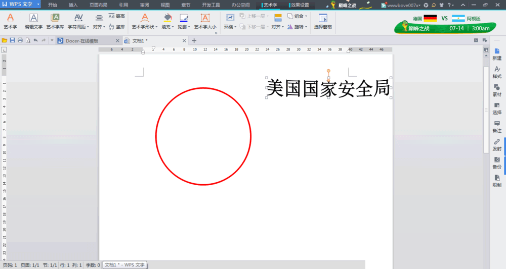 7、先插入藝術(shù)字。選第一種藝術(shù)字,輸入 美 國(guó) 國(guó) 家 安 全 局(最好每個(gè)字之間加空空格)。