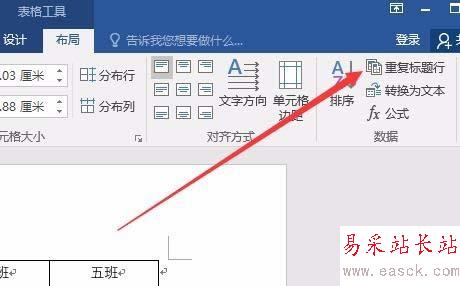 3、把鼠標定位到表格的標題行,然后點擊布局工具欄上的重復標題行按鈕