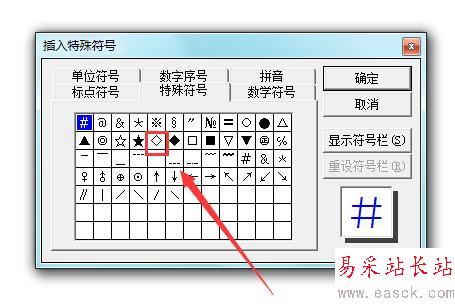 5、在該對話框內找到特殊符號選項,并在其內找到菱形選項,如圖所示: