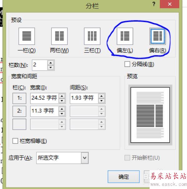 4、如果你還有什么特別的要求你可以選擇最下方的”更多分欄“,然后會跳出如圖所示的窗口,你可以對你分欄的內容進行設置,比如分成兩欄時你可以選擇是偏左還是偏右,這都是根據自己的需要進行設置