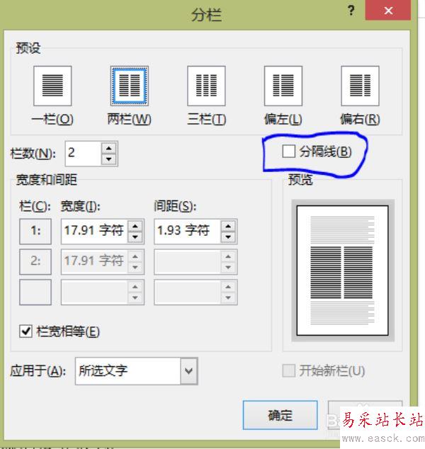 5、當然如果需要要的話你還可以對你分欄的內容添加分隔線,位置如圖所示