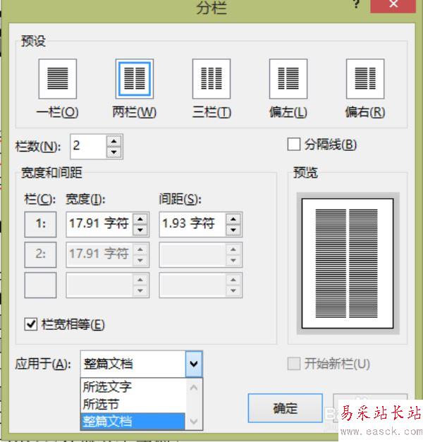 7、最后如果你想對整篇文檔進行分欄處理的話,選擇如圖所示的”整篇文檔“即可