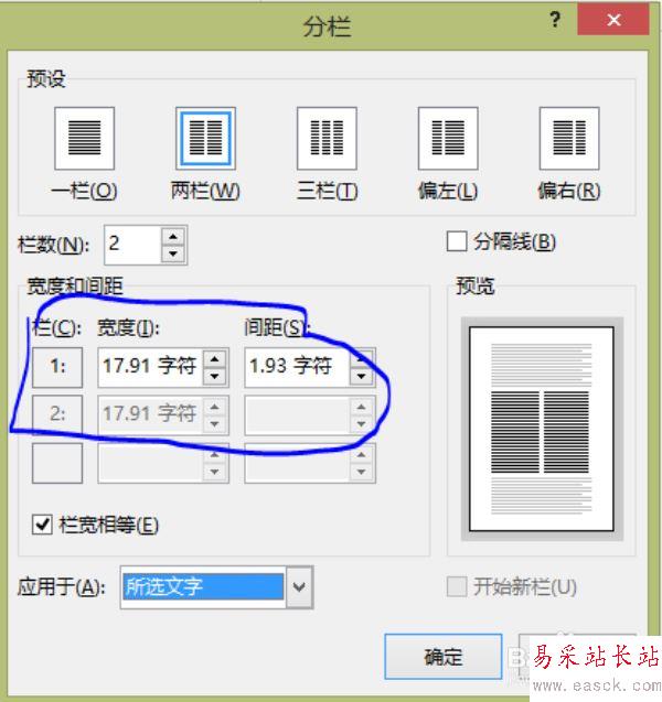 6、分欄的寬度和高度也自己可以設置,注意單位是”字符“