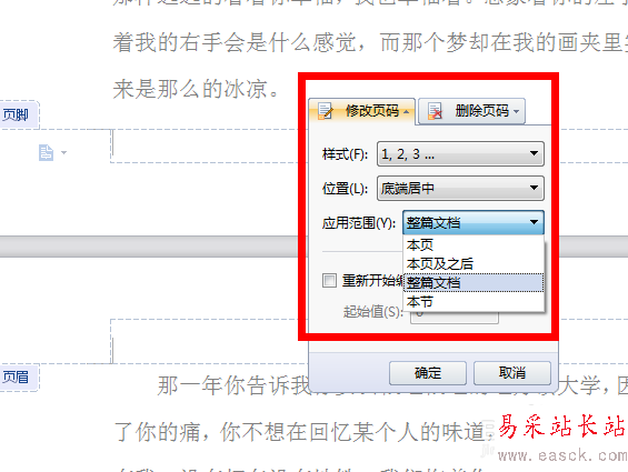 6、一般可以選擇修改頁碼,然后可以選擇是從本頁開始還是整篇文檔都插入頁碼,編輯好了之后就可以了,文檔里面就插入了自己想要的頁碼了,而且是自動排好的,不用我們在手動填入數字了