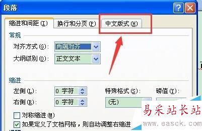 2、在段落選項窗口里,再選擇右邊的“中文版式”選項頁面: