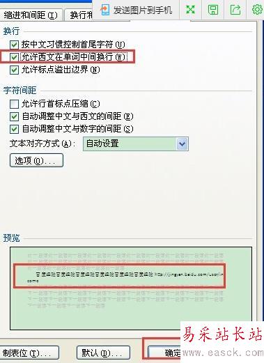 4、我們勾選這個“允許西文在單詞中間換行”選項,可以看到預(yù)覽這里與剛才的格式變化了,再點擊確定按鈕: