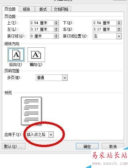 5、這里注意,如果不需要改變前面頁的方向,要在下面“應用于“選擇”插入點之后“