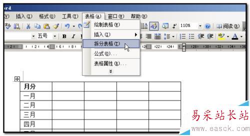 3、然后,在文檔上方的命令欄中順序點:表格-拆分表格;即可把表格從七月這一行上面分開,一到六月為一表格;七到十二月為一表格;