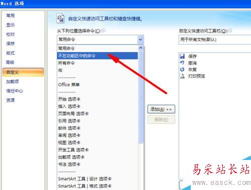 5、選擇小倒三角形之后會有一個選項,那就是“不在功能區中的命令”,我們單擊該選項。