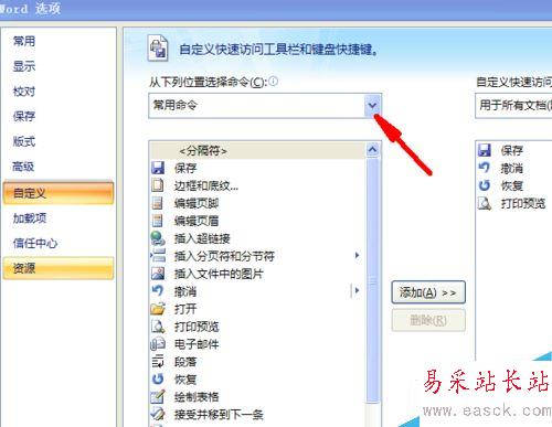 4、選擇自定義按鈕之后會進入到自定義控制面板,我們單擊“從下列位置選擇命令”下方的小倒三角形。