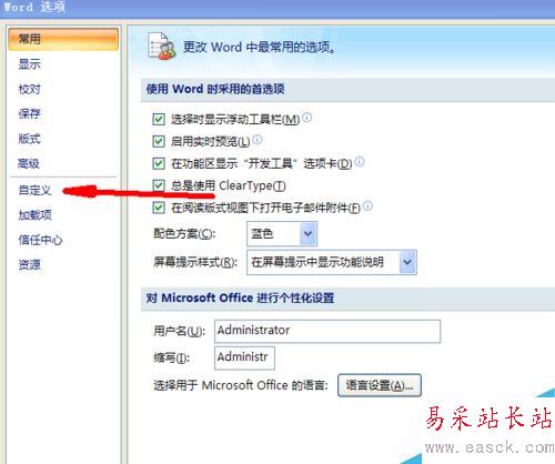 3、選擇word選項按鈕之后會彈出如圖對話框,此時我們選擇左側的“自定義”按鈕。