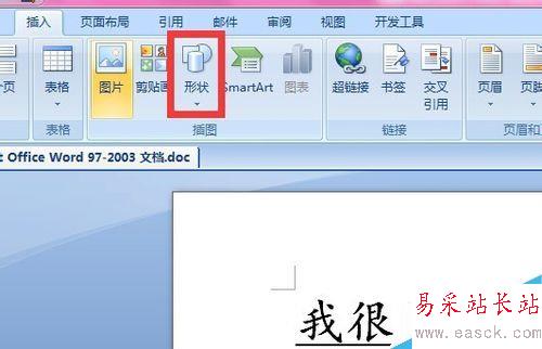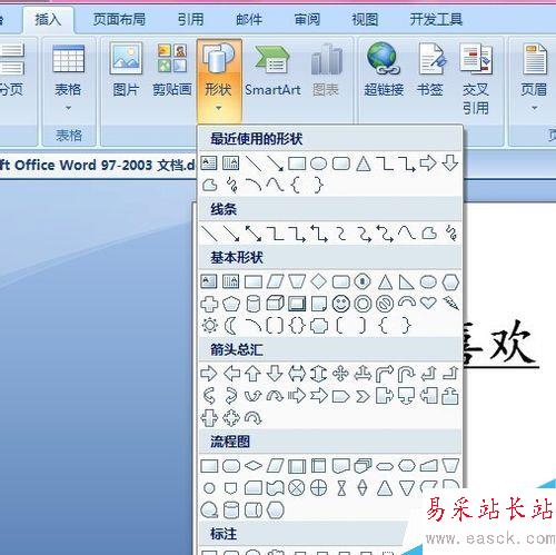 4、這時(shí)點(diǎn)擊形狀下的一個(gè)小三角,便會出現(xiàn)下拉菜單,里面很多圖形。