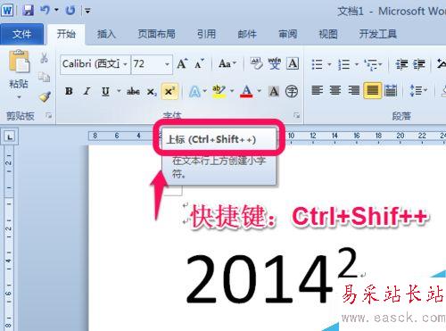 使用快捷鍵,我們把鼠標放到上標圖標處不動,可以看到會顯示其快捷鍵“Ctrl+Shif++”,如圖。