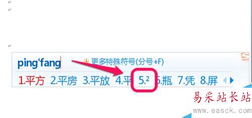 我們直接用搜狗輸入法直接輸入:我們拼寫“平方(pingfang)”,如圖,選擇數字符號的平方。