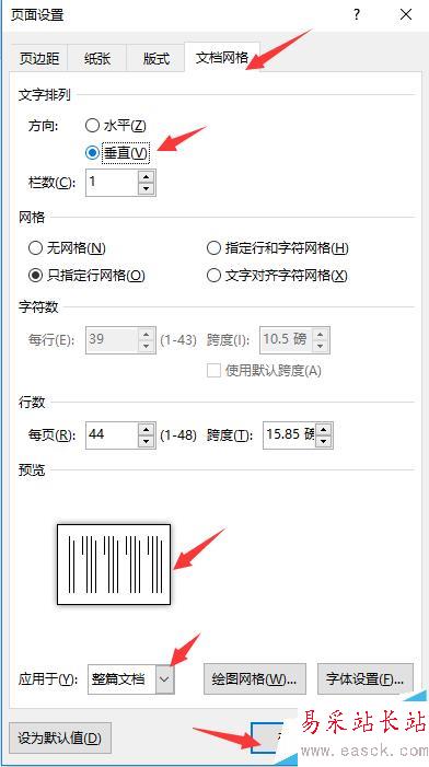 2、找到“文檔網格”,在文字排列中找到“方向”,選擇“垂直”即可,下面有預覽,可參考,再”確定“即可。頁面設置相關設置如下,如下圖示:
