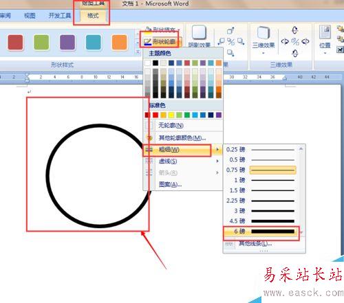 2、【格式】菜單-【形狀輪廓】-【粗細】-【6磅】。如下圖所示: