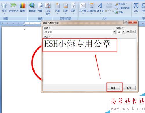 【編輯藝術字文字】輸入【文本】(作為公章底下的文字)并點擊確定即可。如下圖所示: