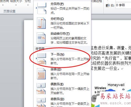 5、如果是要分節的話,就點擊下面的第四個選項,分節符里面的下一頁,此時就會跳到下一節。提示一下,分節與頁眉頁腳有關,與打印出來的效果無關。