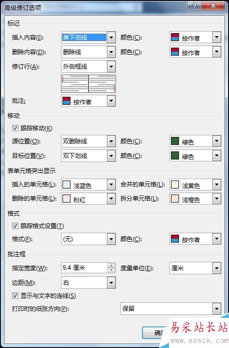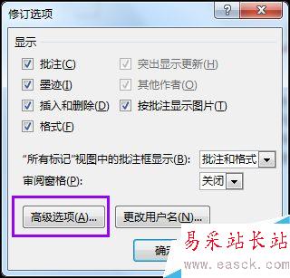 7、打開”高級修訂選項“對話框,對修訂窗口顏色等進行設置,設置完成后單擊”確定“按鈕即可,如下圖。