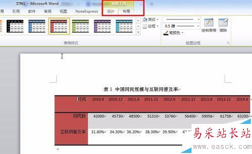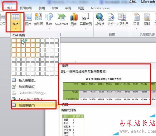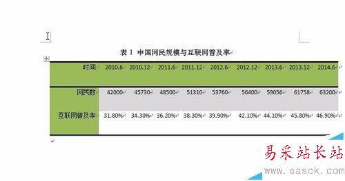 1、在下圖所示的文檔中,中國網民規模與互聯網普及率這個表格很有可能在撰寫其他文檔時會再次用到,所以這里我們將它以表格部件的形式保存起來;
