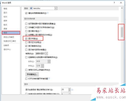 3、如果想顯示書簽,可以在文件-->選項-->高級-->選中顯示書簽既可以,word中會顯示書簽。