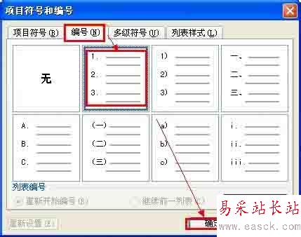 6、在打開的“項目符號和編號”對話框,切換到“編號”選項卡,選擇一種編號格式(例如下圖選擇的編號格式),然后單擊“確定”。