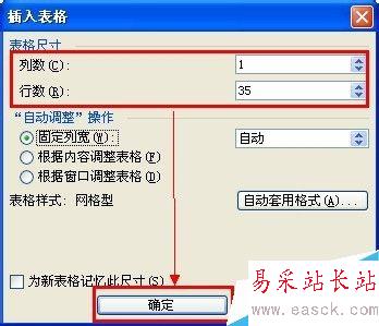 2、在打開的“插入表格”對話框,輸入行數,這里輸入“1”即可;輸入列數,這里為編號的最大值,如生成最大編號“35”,這里就輸入“35”。然后單擊“確定”。