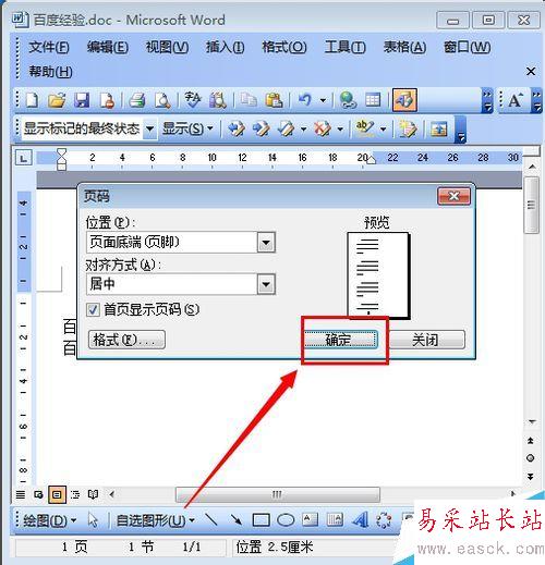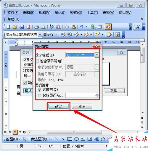 7、然后再頁碼的設置窗口里點擊“確定” 如圖
