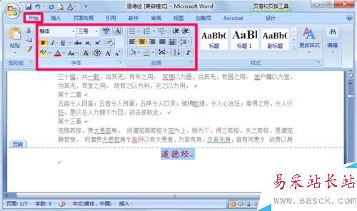 3、這時我們選中輸入的內容,切換到開始選項卡,在下方我們就可以像平時那樣為頁腳文字修改字體格式以及對齊方式等等。