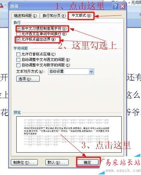 在彈出的“段落”對話框中選擇“中文版式”,把“按中文習慣控制首尾字符”和“允許標點溢出邊界”的前面打上對號。