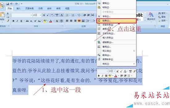選中這一段,在上面點擊鼠標右鍵,在下拉菜單中選擇“段落”。