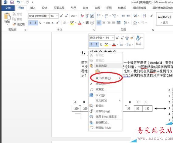 2、鼠標右鍵單擊,在彈出的菜單欄中鼠標移動選擇“展開/折疊”