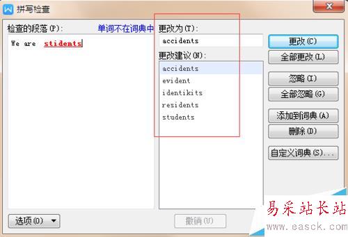 3、然后會出現對話框,這里有更正建議,根據建議提示我們選擇正確的拼寫方法,接著點擊更改。