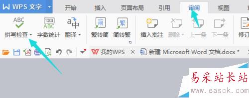 2、這時候我們執行“審閱”——“拼寫檢查”,如圖所示位置: