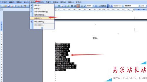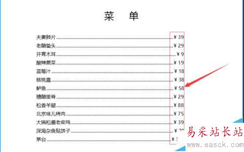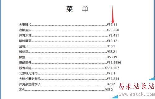 6、其它設(shè)置:編輯后的菜單文檔因價(jià)格位數(shù)不一致,造成價(jià)格沒有右對齊,如下圖1所示。此情況在設(shè)置制表位時(shí)可以采取右對齊方式,編輯后如下圖2所示。價(jià)格上若有分位數(shù),則通常選擇小數(shù)點(diǎn)為對齊方式,如下圖3所示。(以下圖片從上到下為圖1、圖2、圖3)