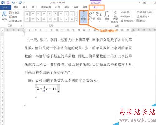3、點出“設計”,這道題中主要用到分數形式,因此點擊“分數”,選擇分數形式。