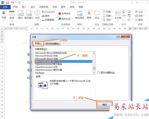 2、選擇新建的對象類型,這里選擇“Microsoft公式3.0”,點擊“確定”。