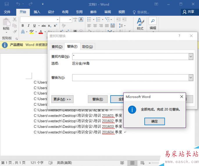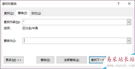 按下Ctrl+H打開查找和替換窗口,在“查找內(nèi)容”中填上“"”(英文半角引號),“替換為”填上一個空格點擊全部替換。成功后,會提示所替換的文字,檢查一下文檔,應(yīng)該不會再有引號了。