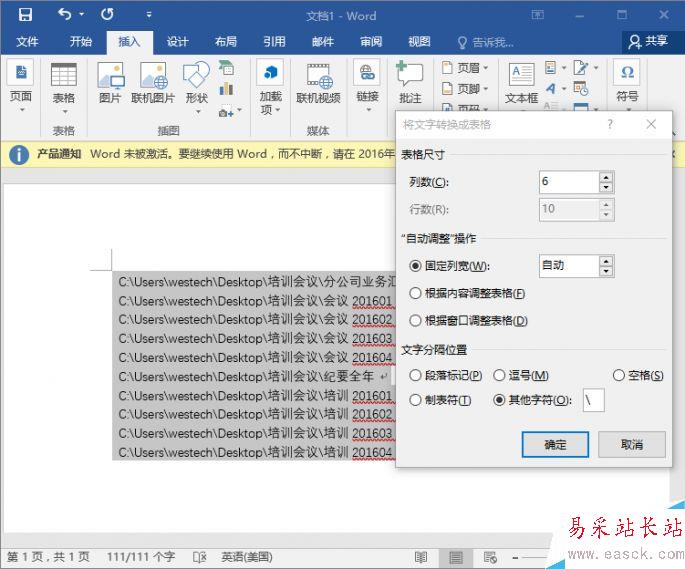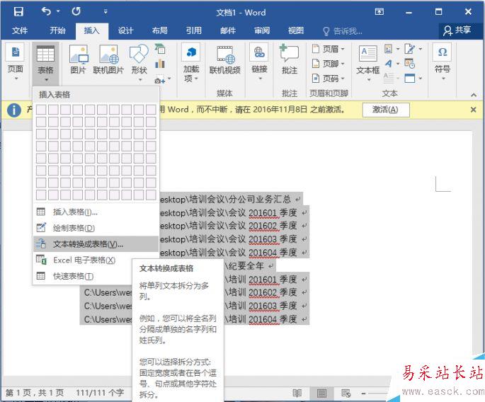 接下來,全選文檔文字(Ctrl+A),并切換選項卡到插入頁,點擊“文本轉(zhuǎn)換成表格”。