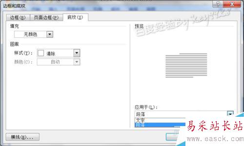 7、在彈出的“邊框和底紋”對話框中,切換到“底紋”選項卡。將“填充”改為“無顏色”,將“圖案”也改成“清除”,再將右下角的“應用于”改為“段落”,這點務必注意: