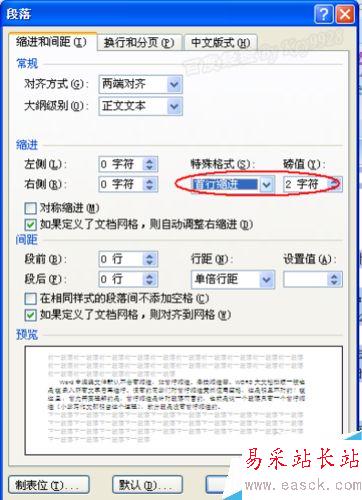 在打開的“段落”對話框中將“特殊格式”設置為“首行縮進”即可: