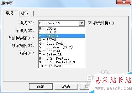 6、在常規選項卡, 我們可設置條形碼的樣式、子樣式,有效性驗證,線條寬度和方向, 我們可以通過下拉列表進行選擇;在右邊的“顯示數據”復選框中勾選或去掉勾可以設置條形碼中是否顯示數據;