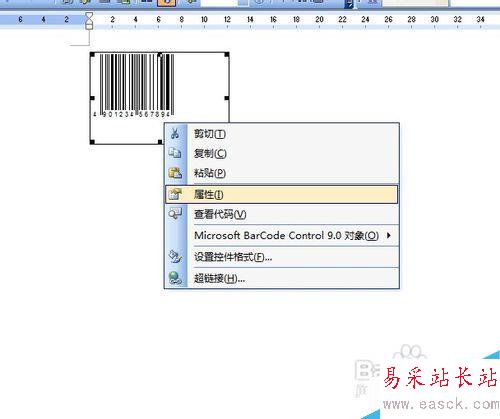 4、若要修改默認條形碼的樣式,條形碼的顏色和線條的寬度等內容, 我們可以右擊我們剛剛插入的條形碼圖標,從中找到屬性選項;如下圖;