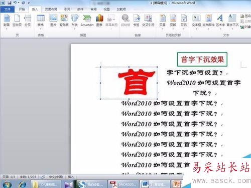 5、此時完成首字下沉操作,首字下沉的效果如下圖所示。