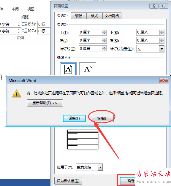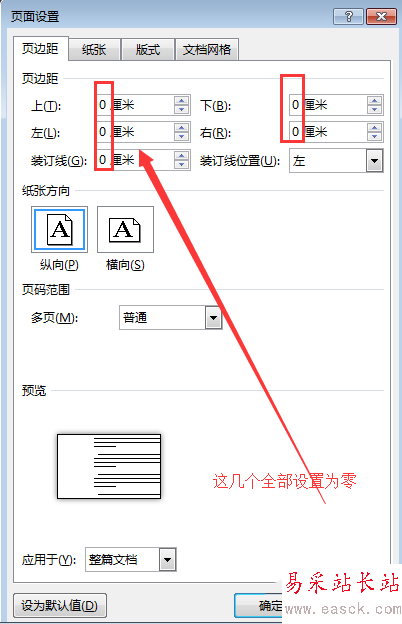 4、彈出頁面設(shè)置對話框,將頁面邊距的上下左右以及裝訂線均設(shè)置為0。