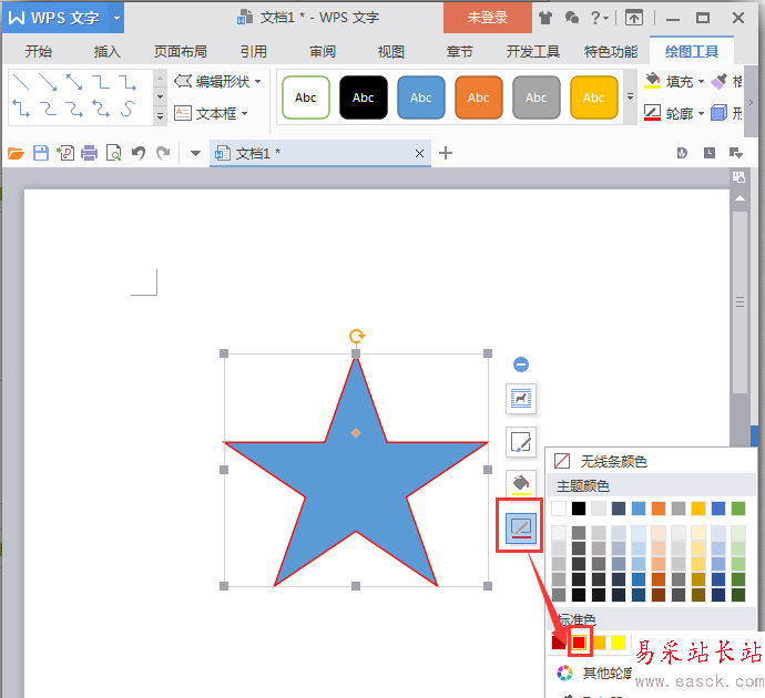 6、點形狀輪廓,選紅色,將五角星的輪廓顏色設置為紅色;